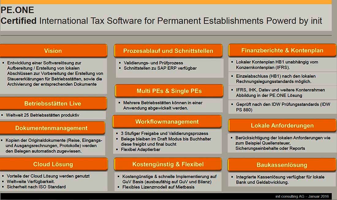 Together with Siemens AG, the Ingolstadt-based company init consulting AG developed a software solution for permanent establishments based on the Authorized OECD Approach (AOA) and the German Act on Applying the Arm’s Length Principle (BsGaV). The solution incorporates all tax-relevant requirements to make tax returns for permanent establishments quick and inexpensive.